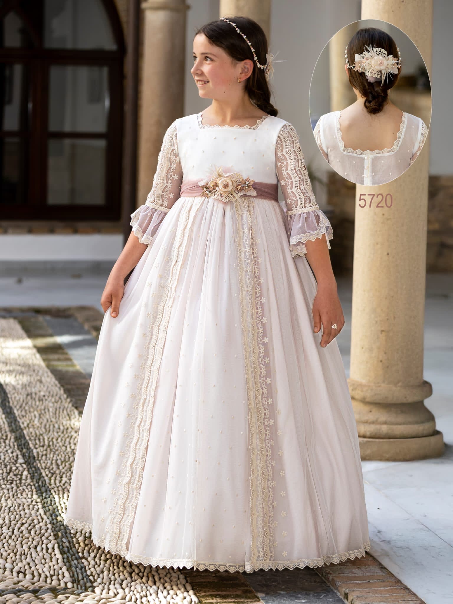 • Niña luce un vestido de primera comunión con bordados, una cadena y un fajín.05050505